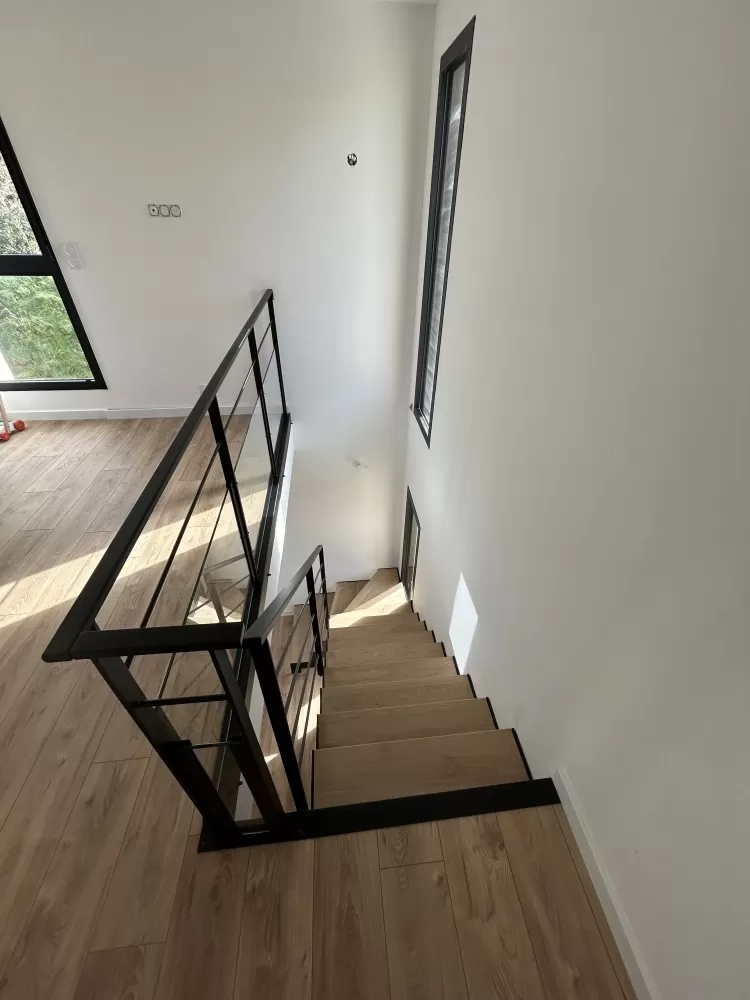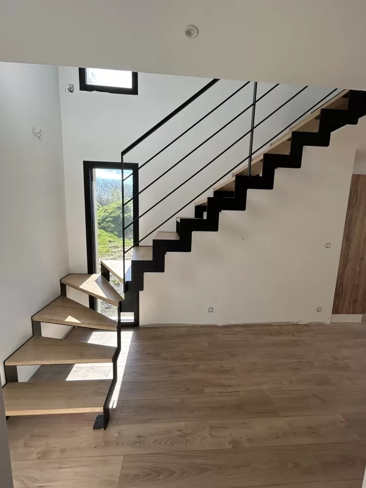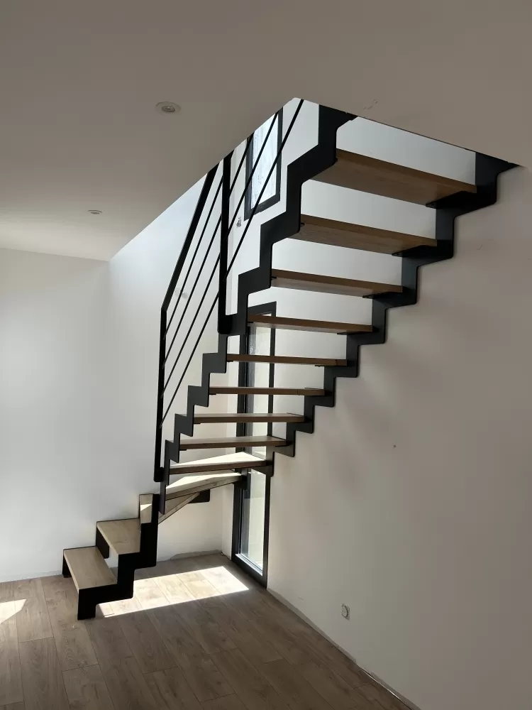 Votre métallier à Noyal, a réalisé un escalier en limons crémaillère chez un particulier, en chêne massif finition par un thermolaquage noir.